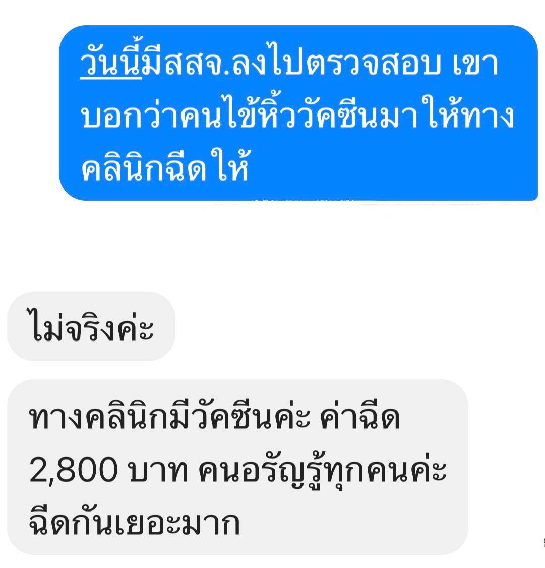 “ทางคลินิกบอกว่าทางคลินิกเองไม่เคยมีวัคซีนจอห์นสัน แอนด์ จอห์นสัน คนไข้หิ้ววัคซีนมาเองทั้งนั้น ทางคลินิกก็เลยฉีดให้ คิดตังค์ค่าบริการ 2,800 บาท แต่เสียงชาวบ้านที่แจ้งผมมา ไม่ตรงกันครับ แจ้งเพื่อทราบ”