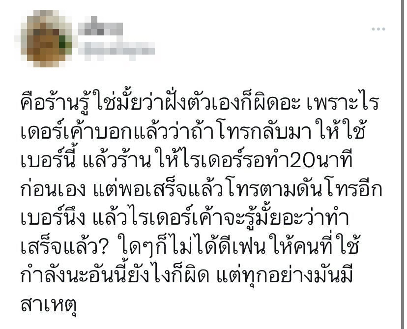 เจ้าของร้านจึงอธิบายไปว่าตลอดวันที่ผ่านมาเธอต้องติดต่อกับไรเดอร์มากมาย จึงเลือกโทรเฉพาะเบอร์ที่ลงทะเบียนเท่านั้น