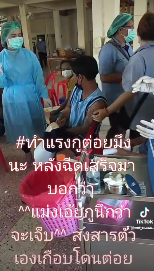 โดยในคลิปนั้นเผยให้เห็นพยาบาลหลายคนช่วยกันจับชายคนหนึ่งที่มีลายสักเต็มแขน แต่เจ้าตัวดันกลัวเข็ม แถมยังพูดขู่พยาบาลด้วยว่า “มึงฉีดเจ็บ กูต่อย” พร้อมทำท่ากำหมัดตอนที่พยาบาลกำลังจะลงเข็ม