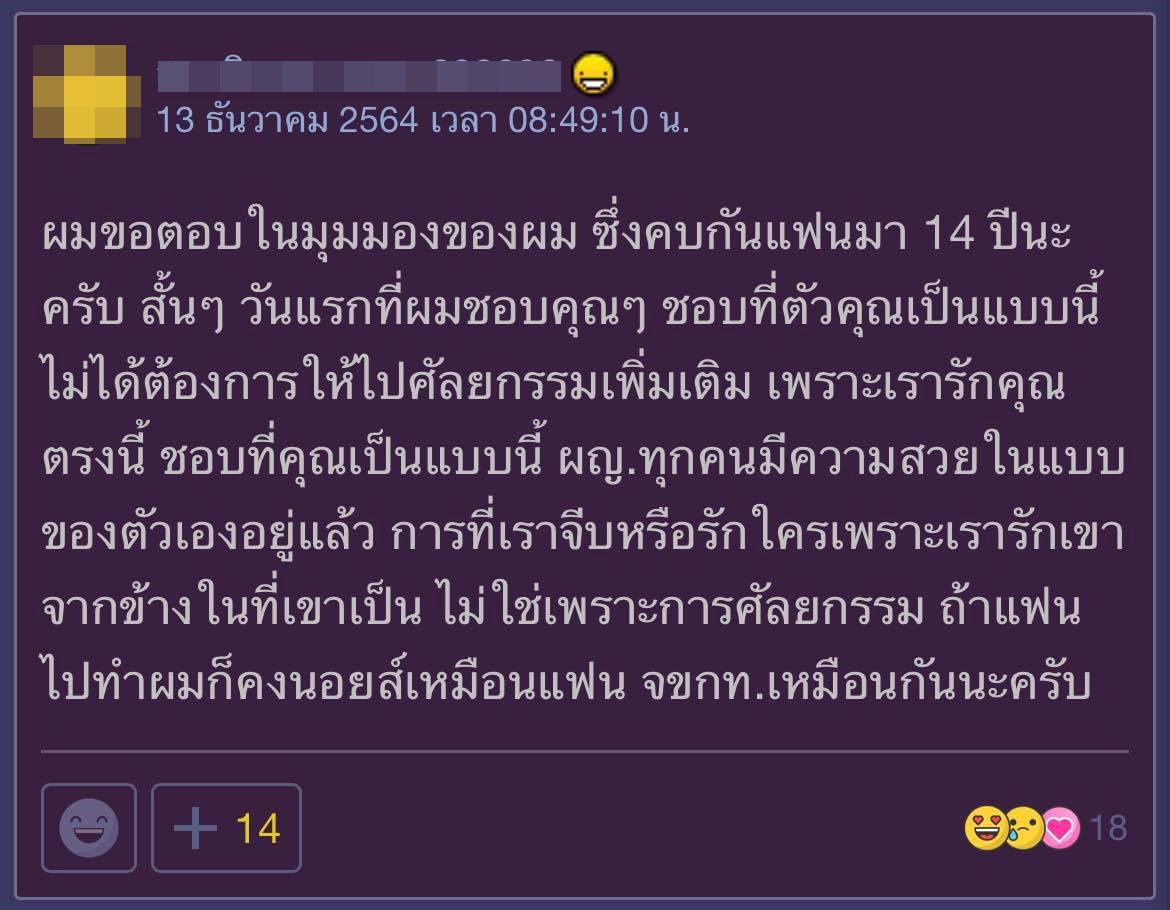 ปรากฏว่าความคิดเห็นของสมาชิกพันทิปส่วนใหญ่กลับเข้าข้างฝ่ายชาย โดยให้เหตุผลที่แตกต่างกันออกไป คนแรกบอกว่า ที่คบกันเพราะรักในสิ่งที่เธอเป็น ไม่ใช่รูปร่างหน้าตา ถ้าแฟนไปทำศัลยกรรม ก็คงโกรธเหมือนกัน
