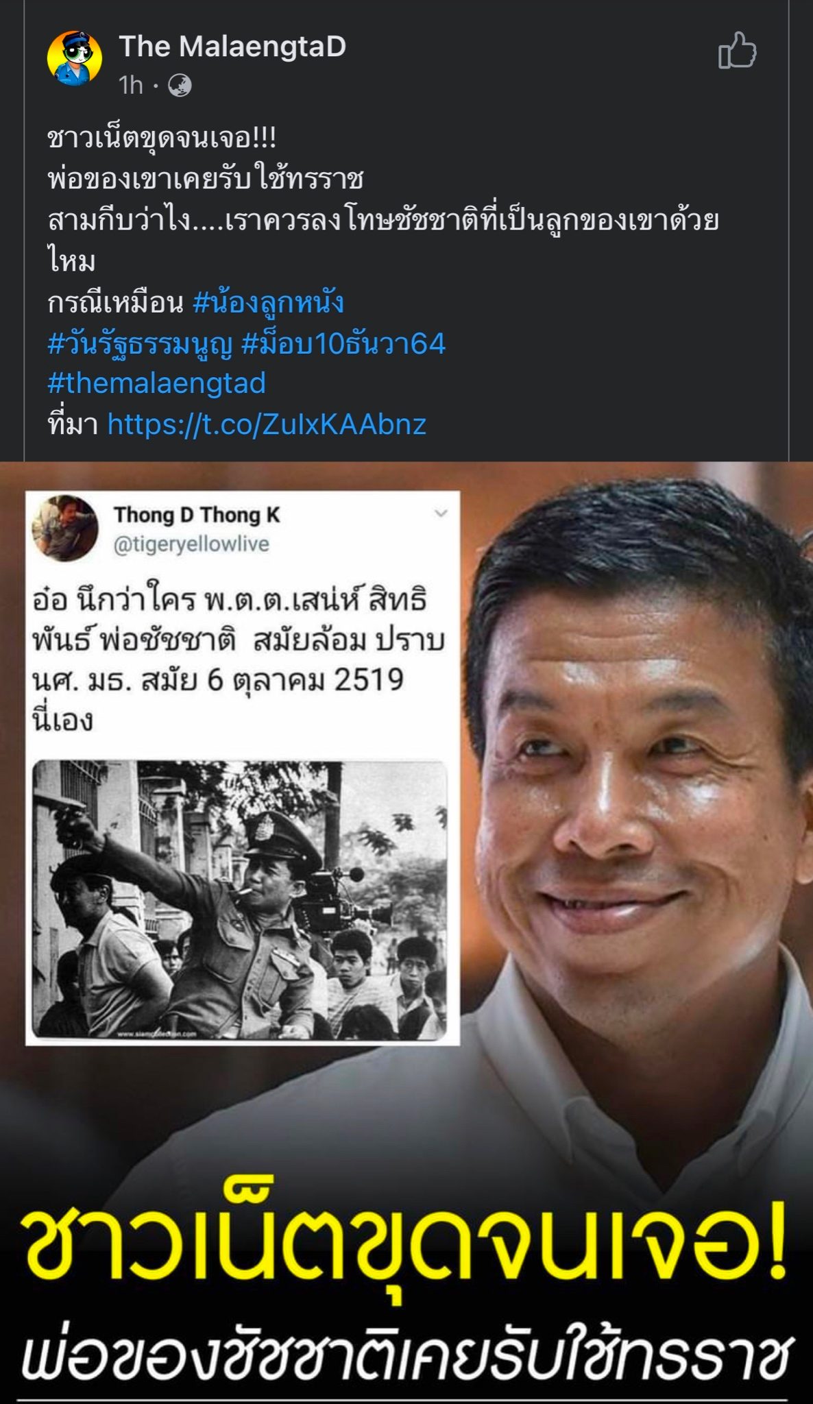 พร้อมกับมีการระบุว่า คนในภาพคือ พ.ต.ต.เสน่ห์ สิทธิพันธ์ ซึ่งเป็นพ่อของชัชชาติ และมีการยกประเด็นขึ้นมาว่า “ชาวเน็ตขุดจนเจอ!! พ่อของเขาเคยรับใช้ทรราช”