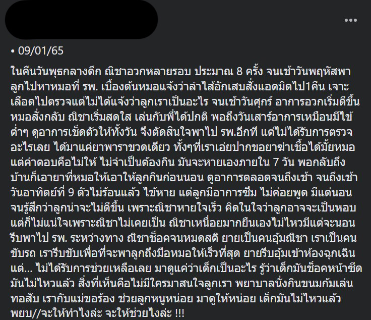 ผู้ใช้เฟซบุ๊กรายหนึ่งได้ออกมาเล่าถึงเหตุการณ์ที่เกิดขึ้นกับเธอ หลังจากที่ลูกน้อยมีอาการป่วย ซึ่งตอนแรกหมอบอกว่าเป็นโรคลำไส้อักเสบจึงสั่งพักรักษาตัวที่โรงพยาบาล 1 คืนและให้ยากลับไปทานที่บ้าน