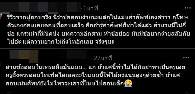 จากโพสต์ข้างต้นนี้ ผู้เข้าสอบหลายคนพูดเป็นเสียเดียวกันว่า ข้อสอบวิชาเอกภาษาอังกฤษ ยากจริง เนื่องจาก ‘ออกคำศัพท์เยอะ ไม่แน่นจริง จะผ่านยาก’