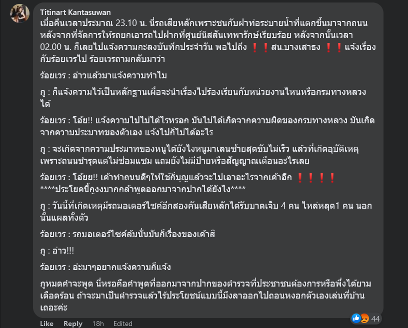 กู : ก็แจ้งความไว้เป็นหลักฐานเผื่อจะนำเรื่องไปร้องเรียนกับหน่วยงานไหนหรือกรมทางหลวงได้