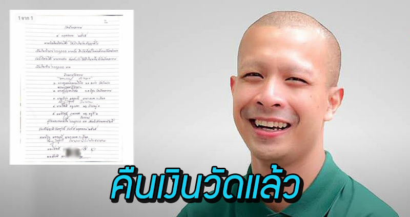 วันนี้ทิศกาโตะ พงศกร จันทร์แก้ว ได้นำเงินมาคืนที่วัดมังคลาราม เป็นจำนวนเงิน 600,000 บาท”