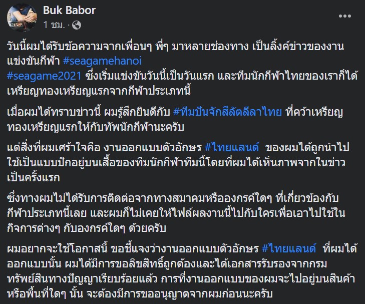 ผมอยากจะใช้โอกาสนี้ ขอชี้แจงว่างานออกแบบตัวอักษร #ไทยแลนด์ ที่ผมได้ออกแบบนั้น ผมได้มีการขอลิขสิทธิ์ถูกต้องและได้เอกสารรับรองจากกรมทรัพย์สินทางปัญญาเรียบร้อยแล้ว การที่งานออกแบบของผมจะไปอยู่บนสินค้าหรือพื้นที่ใดๆ นั้น จะต้องมีการขออนุญาตจากผมก่อนนะครับ ” ข้อความบางส่วนจากโพสต์
