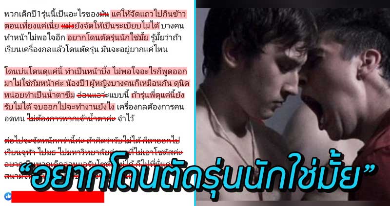 “พวกเด็กปี 1 รุ่นนี้เป็นอะไรของมัน แค่ให้จัดแถวไปกินข้าวตอนเที่ยงแค่เนี้ย ยังจัดให้เป็นระเบียบไม่ได้ บางคนก็ทำหน้าไม่พอใจ รู้มั้ยว่าเรียนเครื่องกลแล้วโดนตัดรุ่น มันจะอยู่ยากแค่ไหน?”
