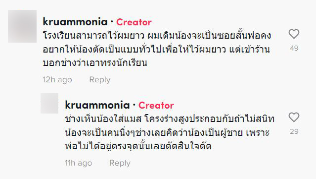 ทั้งนี้คุณครูหมายเหตุว่าโรงเรียนไม่ได้บังคับเรื่องทรงผม และคาดว่าช่างอาจคิดว่าน้องเป็นผู้ชายเพราะใส่แมสก์