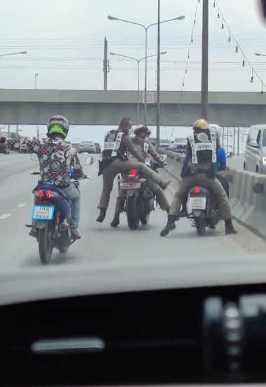 ผู้ใช้เฟซบุ๊ก Nakarin Rakrachakarnได้โพสต์คลิปเหตุการณ์ ขณะที่จักรยานยนต์คันหนึ่งกำลังหนีด่าน พร้อมกับหิ้วตำรวจนายหนึ่งไปด้วย
