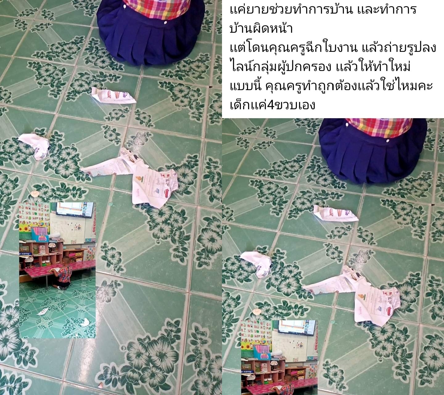 “เเค่ยายช่วยทำการบ้าน เเละทำการบ้านผิดหน้า เเต่โดนคุณครูฉีกใบงาน แล้วถ่ายรูปลงไลน์กลุ่มผู้ปกครอง เเล้วให้ทำใหม่ แบบนี้ คุณครูทำถูกต้องเเล้วใช่ไหมคะ เด็กเเค่4ขวบเอง” ข้อความจากโพสต์ดังกล่าว