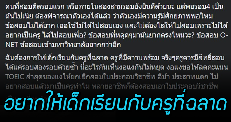 “เข้าใจที่ต้องการจะบอกนะ ว่าต้องการครูที่ฉลาด แต่ไม่เข้าใจประเด็นว่าสอบหลายรอบแล้วผ่านถึงต้องพิจรณาตัวเองด้วยอะ ส่วนจะยินดีหรือไม่ยินดีส่วนตัวคิดว่าคนสอบผ่านเค้าไม่ได้โฟกัสขนาดนั้นหรอก”