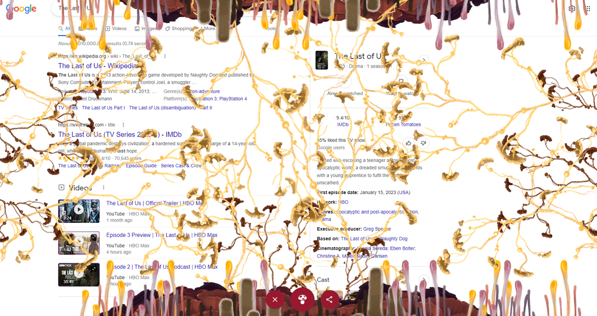 โดยถ้าเราค้นหาคำว่า The Last of Us ผ่านทาง www.google.com หน้าผลการค้นหาจะมีปุ่มรูปเห็ดสีแดงเพิ่มขึ้นมา