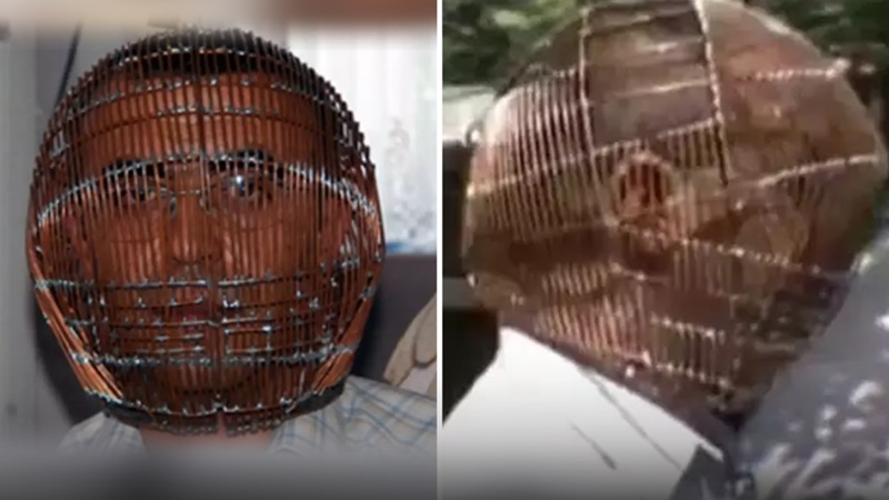 เขาใช้ลวดทองแดงความยาวประมาณ 40 เมตร มาดัด สาน เป็น “กรงครอบหัว” แล้วก็มีที่ไขกุญแจด้วย โดยจะมอบกุญแจไว้กับคนที่ไว้ใจซึ่งก็คือครอบครัว และเวลาที่จะเปิดออกมาก็เป็นแค่ตอนกินข้าวเท่านั้น
