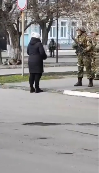 Ukrainian woman confronts Russian soldiers in Henychesk, Kherson region. Asks them why they came to our land and urges to put sunflower seeds in their pockets [so that flowers would grow when they die on the Ukrainian land] pic.twitter.com/ztTx2qK7kB