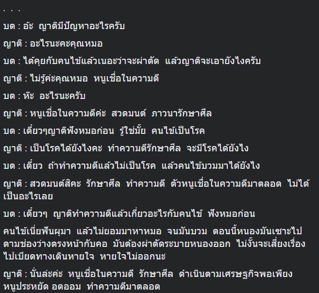 พยบ : ป่าวค่ะคุณหมอ เค้าไม่อยากผ่าตัด เผื่อจะเป็นอะไรขึ้นมา เค้าอยากกลับ รักษาแบบธรรมชาติความดี อะไรไม่รู้ค่ะ
