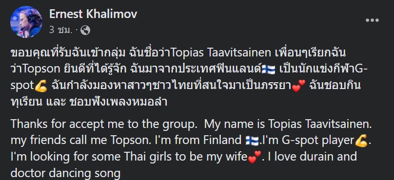 “ขอบคุณที่รับฉันเข้ากลุ่ม ฉันชื่อว่าTopias Taavitsainen เพื่อนๆเรียกฉันว่าTopson ยินดีที่ได้รู้จัก ฉันมาจากประเทศฟินแลนด์🇫🇮