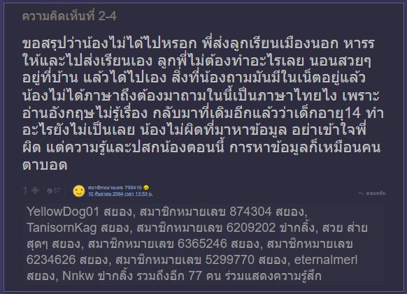จนมีผู้ใช้อีกคนหนึ่งมาคอมเมนต์วิจารณ์คู่กรณีคนดังกล่าว และขออยู่ฝั่งเด็กหญิงเจ้าของกระทู้