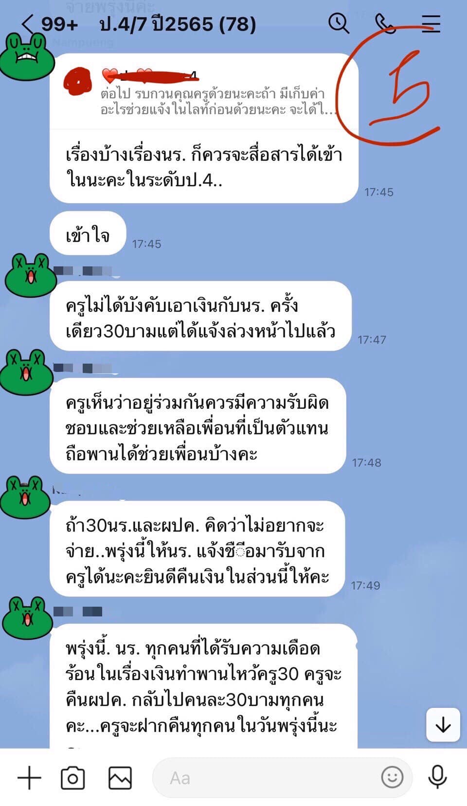 โดยผู้ปกครองเข้ามาสอบถามกับครูว่ามีการเก็บค่าอะไรรึเปล่า? เพราะลูกเพิ่งมาบอก และไม่ได้ให้เงินเพิ่มไปที่โรงเรียน จนทำให้มีเงินไม่พอสำหรับค่าข้าว จึงฝากบอกคุณครูไว้ว่า “จะเก็บค่าอะไร ให้มาแจ้งผู้ปกครองก่อนทุกครั้ง”